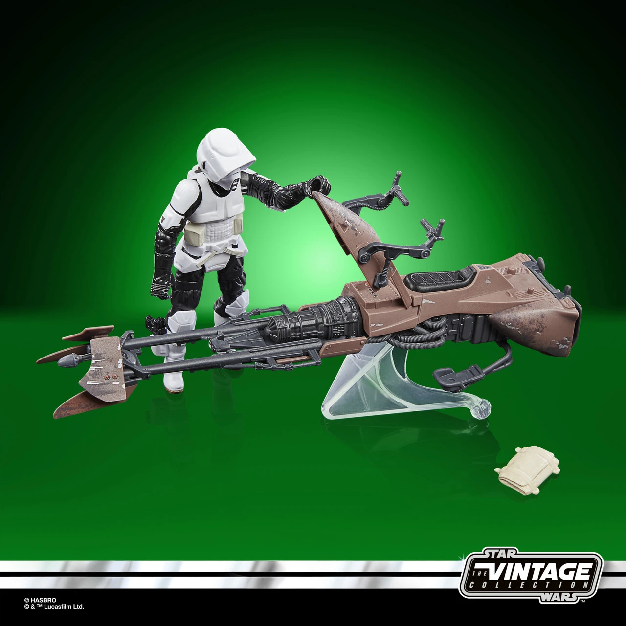 From Hasbro Toy Group. This Star Wars The Vintage Collection 3.75-inch vehicle is inspired by the speeder bikes seen in Star Wars: Return of the Jedi! With realistic detail including 2 speed flaps and a blaster, this Star Wars vehicle comes with a Scout Trooper collector figure that is highly articulated with a fully poseable head, arms, and legs. Calling back to the original 1970s Star Wars collectibles, The Vintage Collection features Kenner branding and package design!
